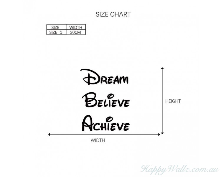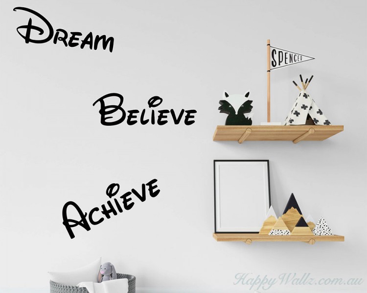 This wall decal is a motivational quote wall decal with the saying: "Dream, Believe, Achieve"