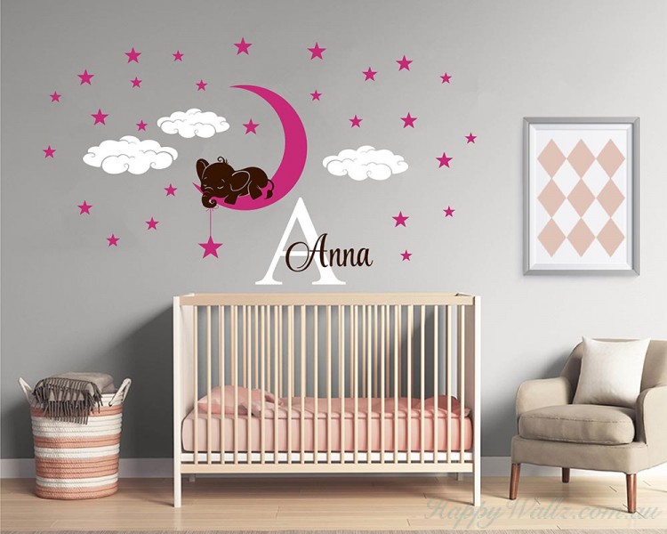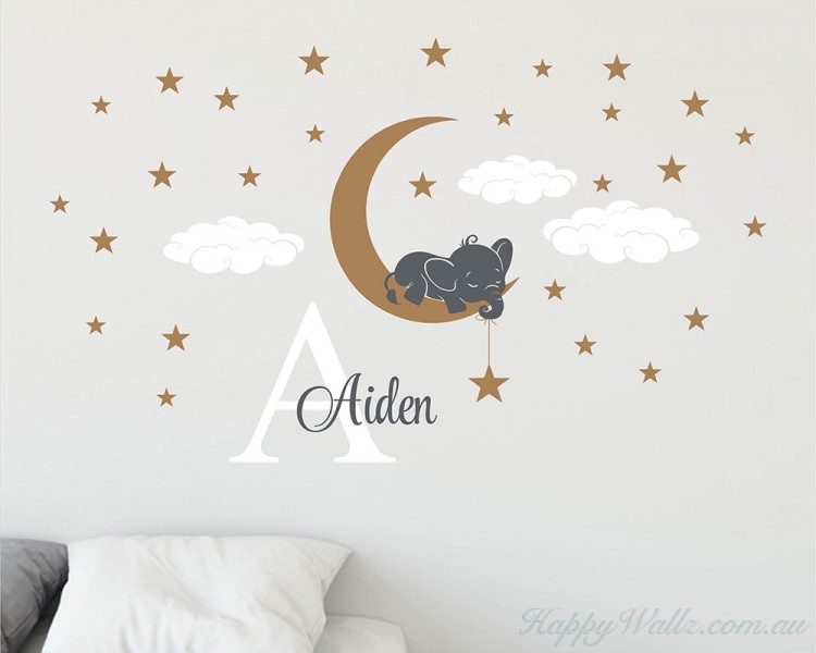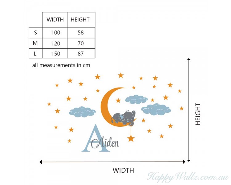 Size is the overall decal when placed as picture shown. The stars, clouds, elephant and name are all separate and you can place them as you'd like.