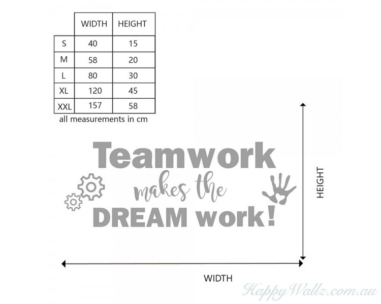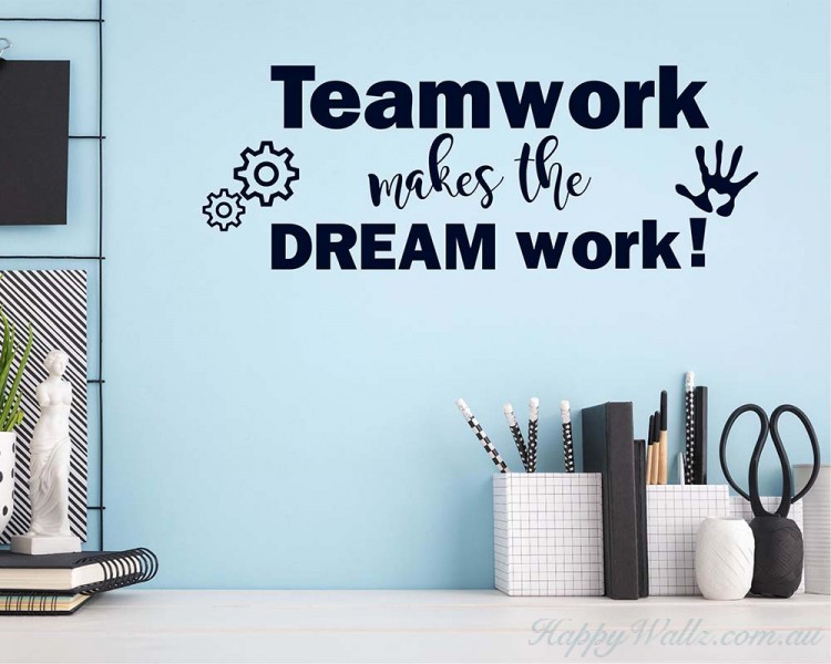 This Teamwork decal is great art for the workspace, business office or school. It has the words "Teamwork Makes the Dream Work" along with a helping hand and gears turning. Motivational wall art to remind everyone that the most valuable asset to any organization are the people and the ideas that each one brings to the table!