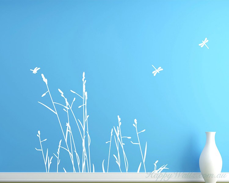 This wall decal is about reed in the wind with some dragonflies flying around.